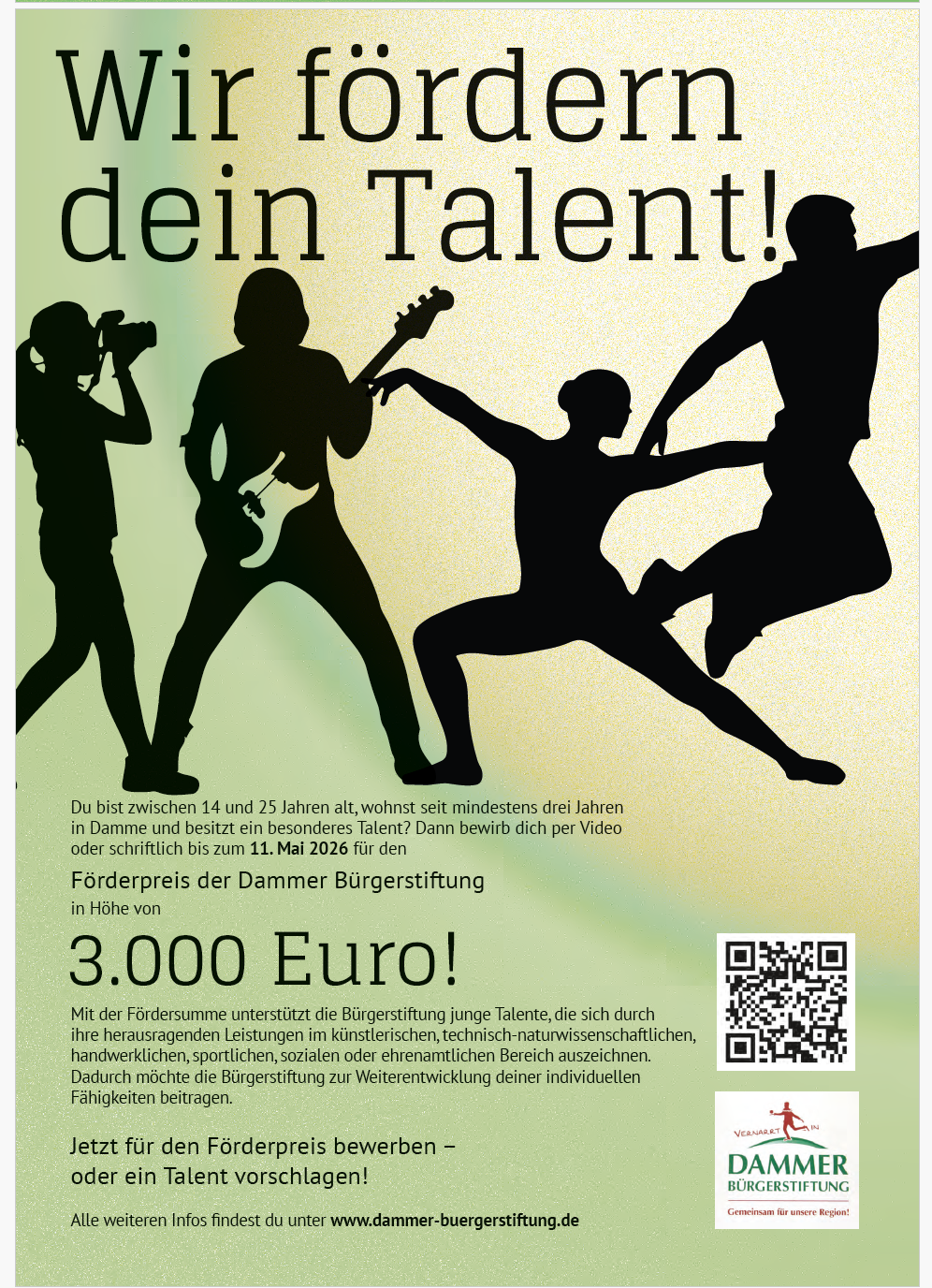 Wer kann sich für den Förderpreis in Höhe von 3.000 € bewerben? Förderwürdig sind Kandidaten, die in Bildung, Ausbildung, bei der Arbeit, in einem Ehrenamt oder in sonstigen Bereichen außergewöhnliche Leistungen und großes Engagement gezeigt haben. Mit der Auszeichnung werden beispielsweise künstlerische Leistungen in Musik, Tanz, Gestaltung, Sprache und Theater, besondere Fähigkeiten im handwerklichen und naturwissenschaftlichen Umfeld oder beeindruckendes Engagement in Sport und Freizeit geehrt. Auch vorbildlicher Einsatz für soziale Projekte zum Beispiel in der Schule, im Sportverein, in der Kirchengemeinde oder im gesellschaftlichen Leben unserer Stadt wird auf diese Weise anerkannt und geehrt. Der Förderpreis dient der Weiterentwicklung von Fähigkeiten und Leistungen – und somit dem eigenen außergewöhnlichen Talent. Er ist mit einem Betrag von 3.000 Euro dotiert, den entweder eine Einzelperson erhält oder der auf mehrere Preisträger aufgeteilt wird. Was sind die Voraussetzungen? Bewerben können sich alle mit einem herausragenden Talent im Alter von 14 und 25 Jahren, die seit mindestens drei Jahren in Damme wohnen. Wie kann ich mich bewerben? Die Kandidatinnen und Kandidaten können sich selbst bewerben oder von Dritten vorgeschlagen werden. Die Bewerbung ist als kurzes Video oder schriftlich möglich und sollte die Infos enthalten, durch welche Fähigkeiten bzw. welches besondere Engagement man sich auszeichnet und warum man den Förderpreis verdient hätte. Ein kurzer Lebenslauf sollte der Bewerbung hinzugefügt werden sowie ein Ausblick gegeben werden, wie man die Fördermittel für die Weiterentwicklung des persönlichen Talentes einsetzen möchte. Bewerbungen können per Mail ( buergerstiftung@damme.de ) oder über den Postweg (Dammer Bürgerstiftung, z. Hd. Claudia Westendorf, Mühlenstraße 18, 49401 Damme) erfolgen. Wichtiger Hinweis für alle, die ein Video einsenden: Sollte dies die Größe von 20 MB überschreiten, bitten wir um alternative Zusendung (zum Beispiel über einen Link oder über die Nutzung eines F ilehosting-Dienstes wie WeTransfer). Bewerbungsschluss ist der 11. Mai 2026 . Wer entscheidet über die Vergabe? Eine Jury, bestehend aus Mitgliedern des Vorstands und des Stiftungsrates der Dammer Bürgerstiftung entscheidet nach Sichtung aller Bewerbungen über die Vergabe des Förderpreises. Der Preis kann auch auf mehrere Preisträger aufgeteilt werden. Der Preisträger oder die Preisträgerin bzw. alle Preisträger werden am 12. Juni 2026 im Rahmen des Stiftermahles der Dammer Bürgerstiftung vorgestellt. Du hast noch Fragen? Schreib uns eine Mail an buergerstiftung@damme.de und wir melden uns, umgehend, um alle Fragen zu beantworten. Auch für ein persönliches Gespräch nehmen wir uns gerne Zeit.